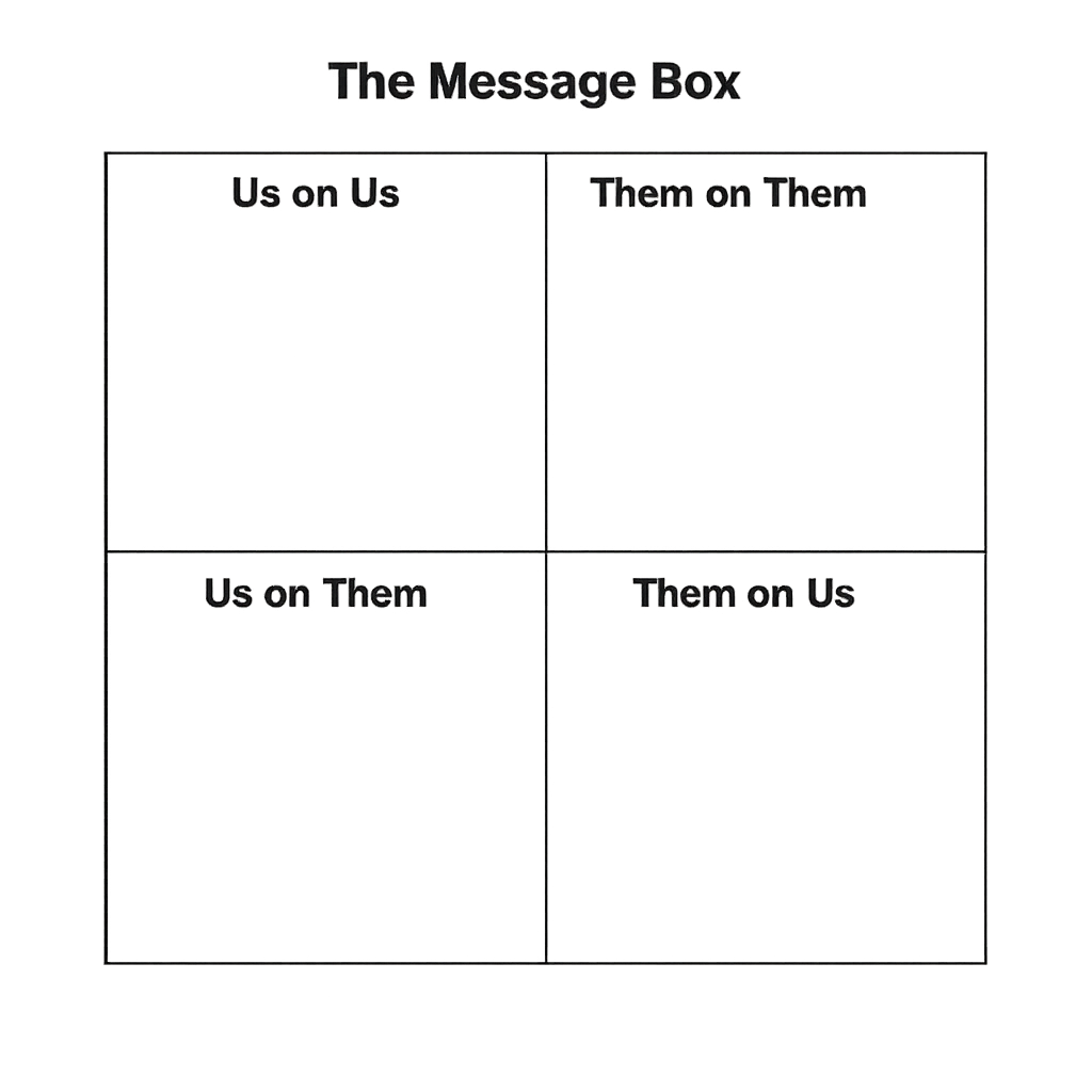 This Message Box helps you clarify what you want to say about yourself, your opponent, and how voters may see you both. “Us on Us” is where you define your strengths, values, and why you are running. The other boxes help you anticipate what others may say about you and your opponent, so you can respond thoughtfully and stay grounded in your key messages. Used early, this tool gives you confidence that your campaign voice is intentional rather than reactive.